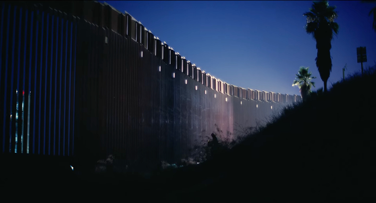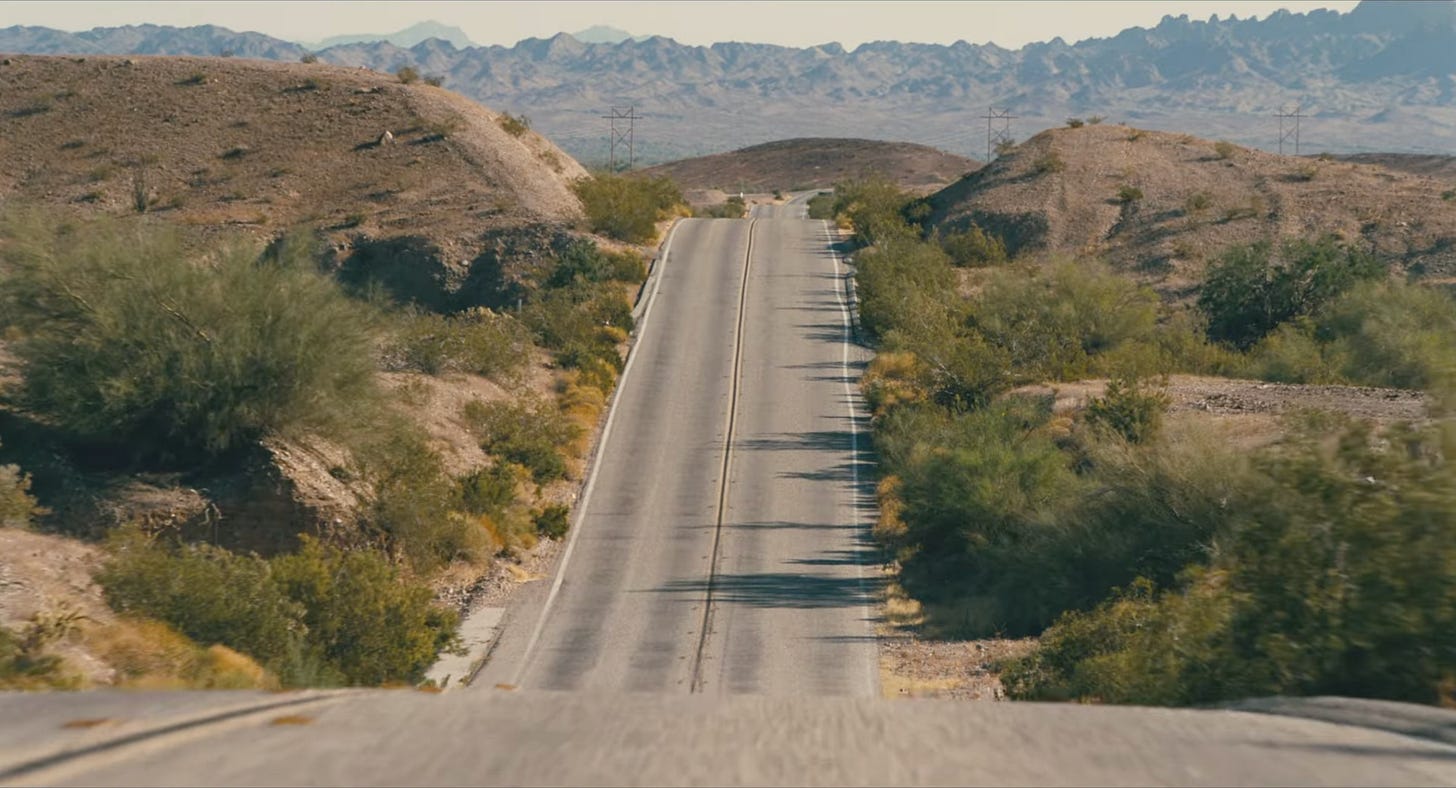 The film climaxes with a four-car chase, sans-dialogue, that can at once recall the primitive origins of silent action cinema (often bound to trains, not cars) as well as the hallucinatory qualities of the 1960-70s genre cinema of psychedelia, in which the rod was so often featured as an extension of its driver’s persona. It’s La Roue and Vanishing Point, it’s Griffith’s Lonedale Operator3 and Dirty Mary, Crazy Larry; Tarantino wept, for he was no longer the greatest cinematic excavator of historic thrills.4 The Two-Lane Blacktop sits atop the hilly California desert plains. At the apex of these large bumps, one can see the apexes ahead and behind. In the depths, one is essentially blind. It’s a setpiece built out of the geography of the highway, which circles back to an idea from the very first image of the film: Perfidia Beverly Hills on foot, ascending a highway offramp that towers above an immigration detention center that the French 75 were preparing to liberate, as unsuspecting cars pass by. She’s an avatar for the viewer in this shot and this shot alone – she can hitch a ride and turn her back on the movement as America continues to crumble at the hands of right-wing ideology, or she can commit domestic terrorism to fight against it. Nobody at my screening turned their backs on the film.