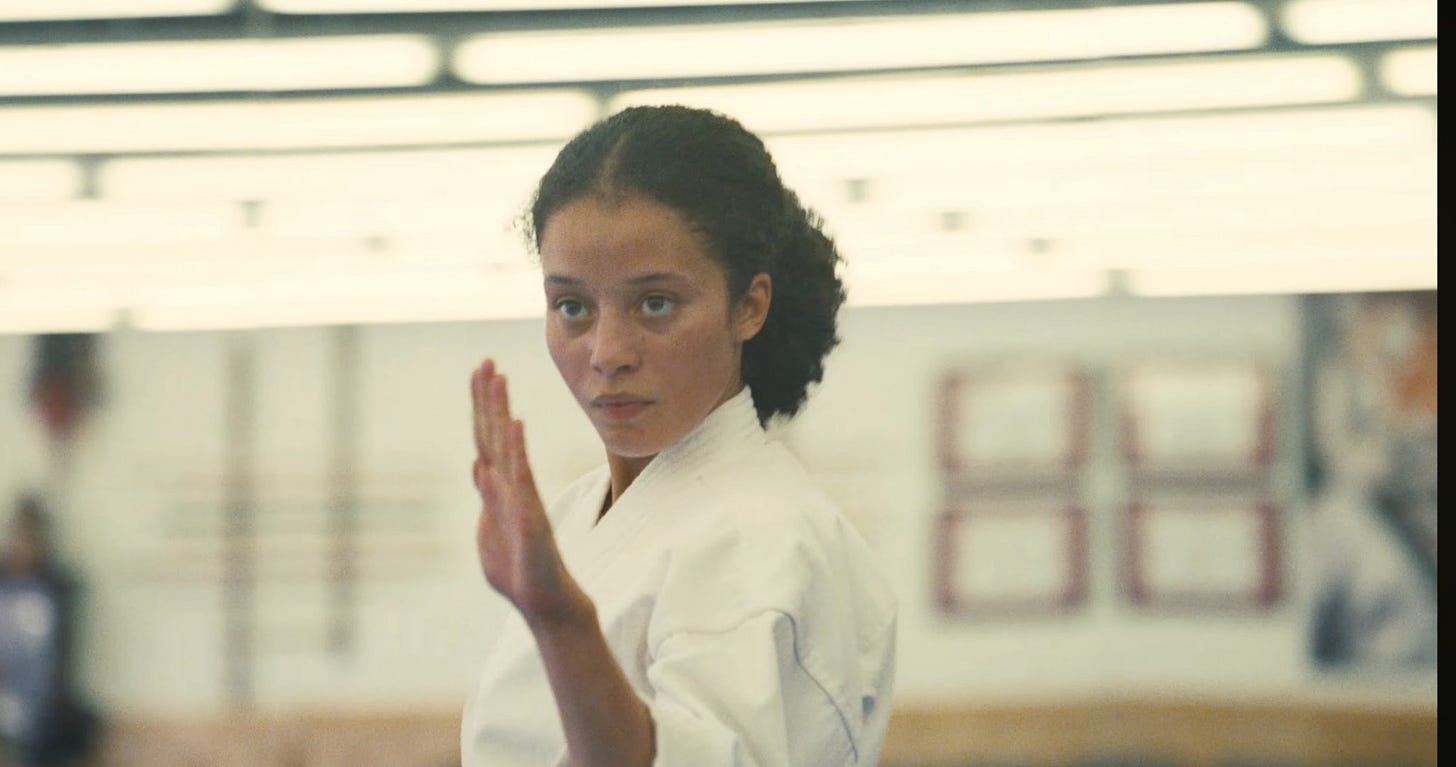 Oh, and it has about five action setpieces, with scope and physicality that I never thought I’d see in a Paul Thomas Anderson film. The first section of the film is essentially an extended montage of French 75 hits, One Setpiece After Another. In a scene drenched in paranoia, one of the French 75 gets assassinated at the supermarket in a moment worthy of Scorsese. Around the midpoint, Benicio’s operation is raided, which leads to a fantastic rooftop sprint. Plenty of other interesting stuff is going on during this action, but let’s focus on that rooftop. The VistaVision photography genuinely evokes the opening of Vertigo, but in a world where Hitchcock never had to use rear projection. Leo follows a trio of the Sensei’s boys in silhouette over an expressionist purple sky2, until he can no longer keep up with their youth.