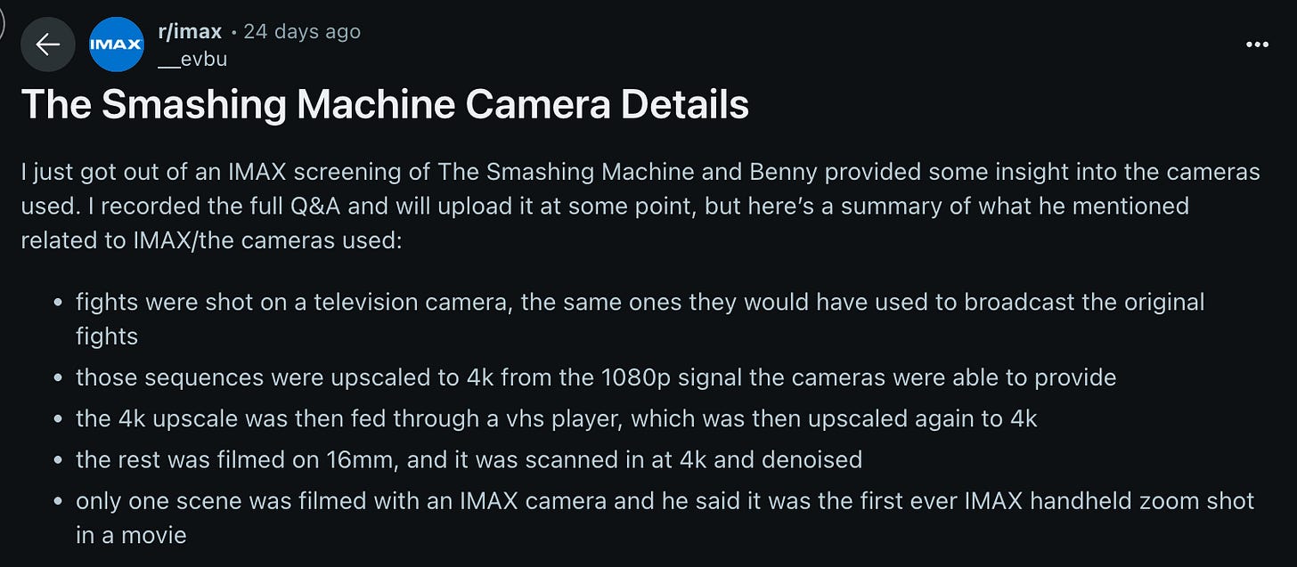 The cinematography is objectively “nice” looking, but also begs a question or two. The 16mm is digitally cleaned up (de-noised) enough for IMAX screens, and there is also 65mm IMAX stock used in a pivotal scene to distinguish fiction from “reality”, or perhaps give off a “larger than life” feel to the quasi-documentary grace note it captures. And yet, the distinction between small and large formats was much more narratively functional and aesthetically daring in a film like Damien Chazelle’s First Man. Why do some of these 16mm images look so god damn clean? What’s the point, if you’re also fucking around with IMAX gear? If you know my taste at all, you know that I am no fan of Damien Chazelle, but this is how low The Smashing Machine stoops, visually. Gone is the scrappy run-and-gun brilliance of Sean Price Williams (Heaven Knows What, Good Time), as well as the measured mastery of Darius Khondji’s frames in Uncut Gems.